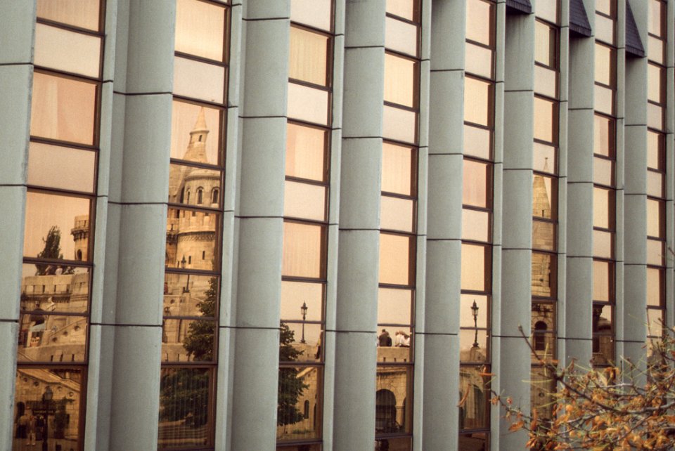 12 Hongarije 1992 The Fisherman's Bastion in Budapest reflected in the golden glass windows, Budapest |
