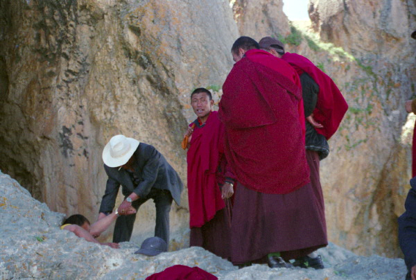 This monk crawls through a hole, as a religious act.