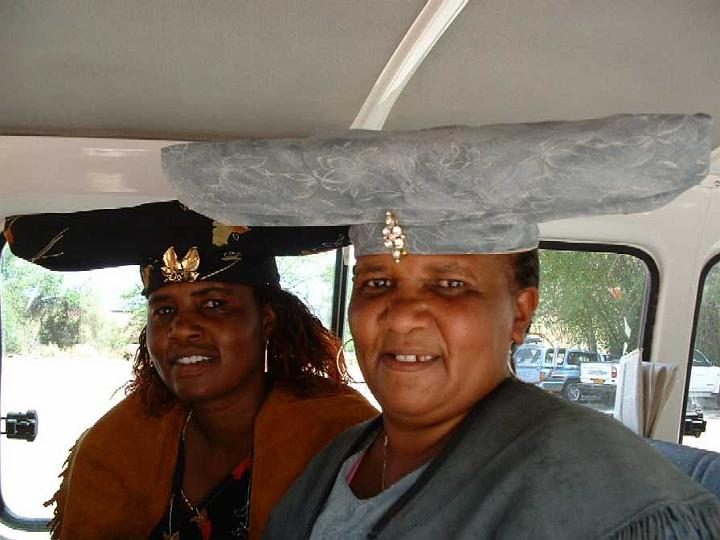 Hererowomen in 'traditional' clothes. Actually it is inspired bij the clothes of missionary wives.