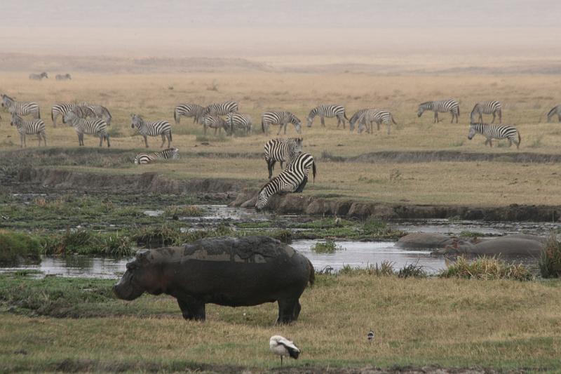 nijlpaard en drinkende zebra